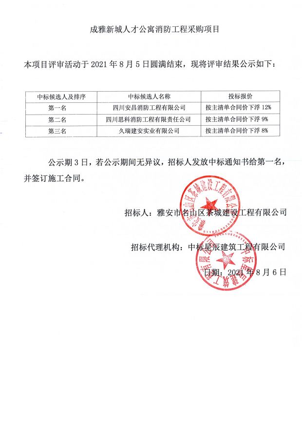 成雅新城人才公寓消防工程采購項目中標公示