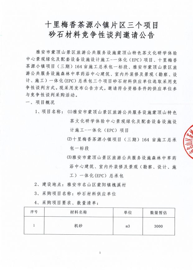 十里梅香茶源小鎮片區三個項目砂石材料競爭性談判邀請公告